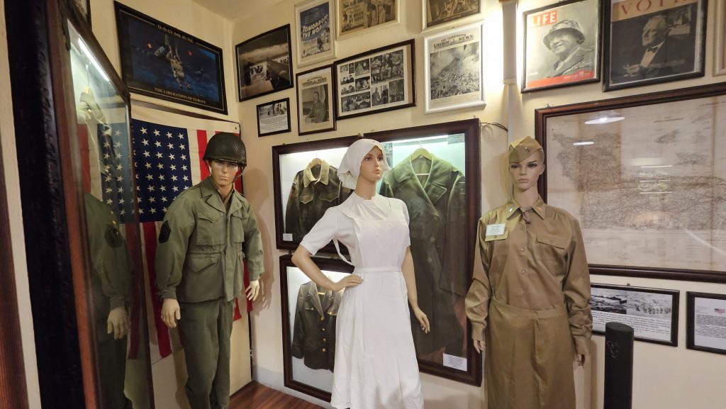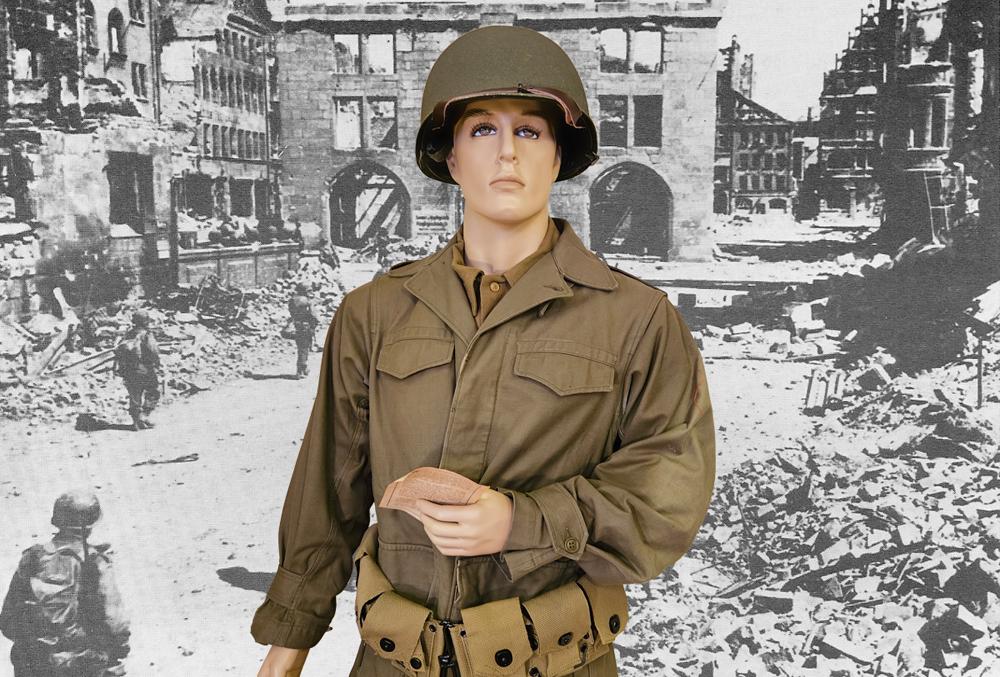 Uniforms of American, British, Commonwealth, French and Dutch soldiers from WWII all on display with full information on each item.