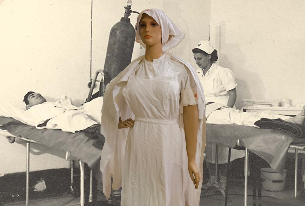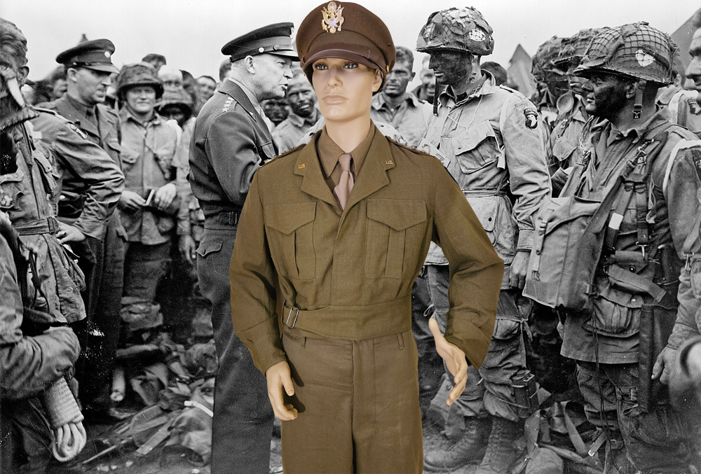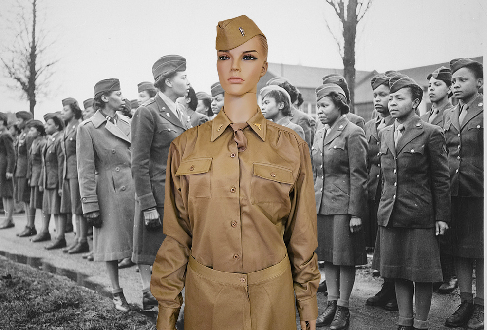 US late war sergeant alongside a French nurse, a WAC officer, and other WW2 era uniforms in frames,